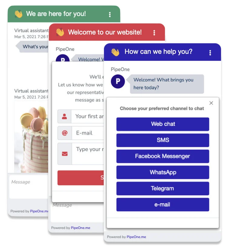 Different channels in one platform for seamless communication with your contacts via WhatsApp, SMS, Instagram DM, Facebook Messenger, Telegram, web chat and QR code.